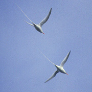 The tropicbirds are medium-sized seabirds with exceptionally long, narrow, central tail feathers that drag gracefully behind them in flight. They are predominantly white in color, with black markings on their face, back, and wings. They are typically found in tropical waters, where they fly with quick, strong wing-beats, or float on the water with their tails cocked. Although they sometimes nest in colonies when the conditions are right, they are not generally social, and are usually found alone at sea. Tropicbirds feed on flying fish, squid, and other aquatic creatures, mainly by plunge-diving into the water. They are highly pelagic, coming to land largely to breed. They first breed at two to four years, are monogamous, and form long-term pair bonds. They nest in crevices or burrows, and both sexes help build the nest, incubate the single egg, and care for the chick for a number of months before it fledges.