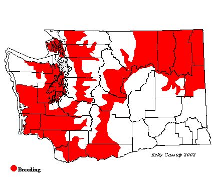 Turkey Vultures can be seen soaring over a wide range of habitats throughout Washington from February to October. In western Washington they can often be seen in the Snoqualmie Valley (King County) and in the Willapa Hills (Pacific County). Wintering birds are rare throughout Washington. During migration they are most common through the Puget Trough area; east of the mountains their migration is on a broad front. Breeding Turkey Vultures are found in the lower forest regions in the western Cascades and are common in the lower forest and adjacent steppe along the eastern Cascades. They are uncommon in the northeastern corner of Washington. Migrants are seldom seen in the Blue Mountains, and breeders have not been reported there. Turkey vultures are uncommon along the outer coast, but probably breed there in small numbers as they do in the foothills of the Olympic Mountains. Turkey Vultures are uncommon to rare in the drier portions of the Columbia Basin, even as migrants.